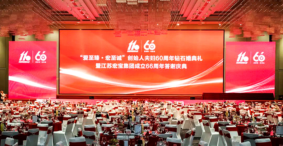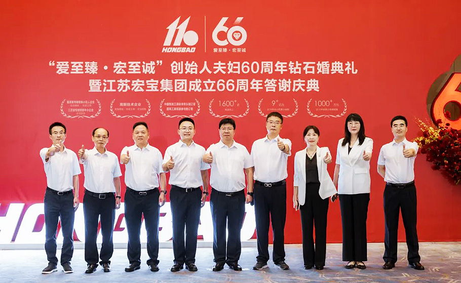 | 2024年9月20日,江蘇宏寶集團公司迎來了建廠66周年,恰逢創始人朱玉寶夫婦結婚60周年紀念日。“愛至臻·宏至誠”創始人夫婦60周年鉆石婚典禮暨江蘇宏寶集團成立66周年答謝慶典隆重舉行。來自社會各界友人、宏寶集團中層以上干部及家屬和員工代表們歡聚一堂,共襄盛典。 |