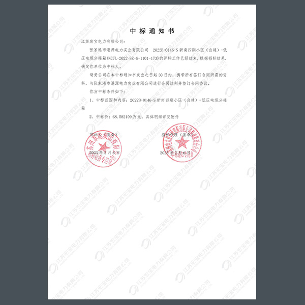低壓電纜分接箱中標通知書